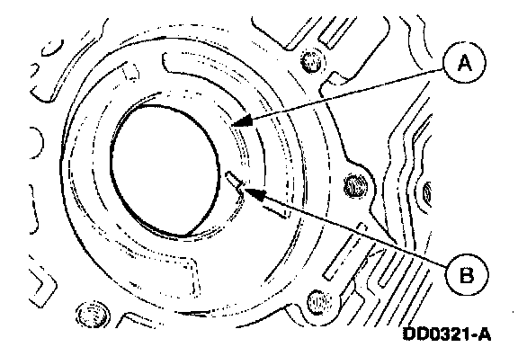 9. Inspect the (A) converter hub bushing. If scored or excessively worn, replace the entire pump. Note the orientation of the (B) lube groove.