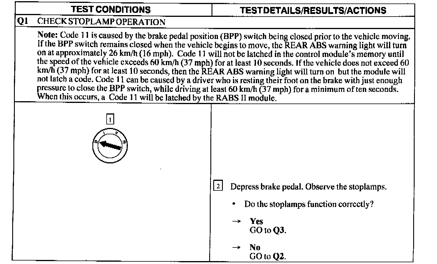 TEST Q: CODE 11 - BRAKE PEDAL POSITION (BPP) SWITCH ALWAYS