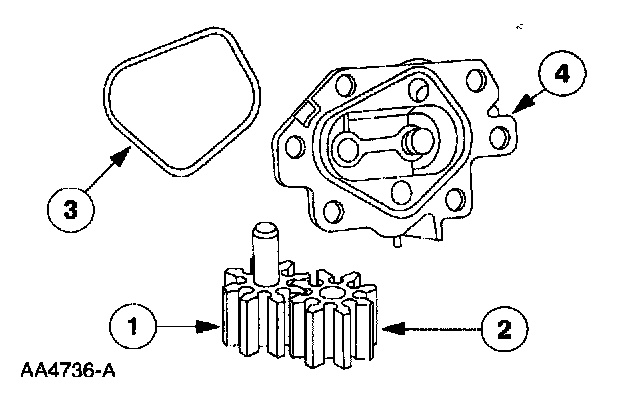 6. Remove the (1) oil pump drive gear, the (2) oil pump driven gear, the (3) oil pump O-ring seal and the (4) oil pump. Discard the oil pump O-ring seal.