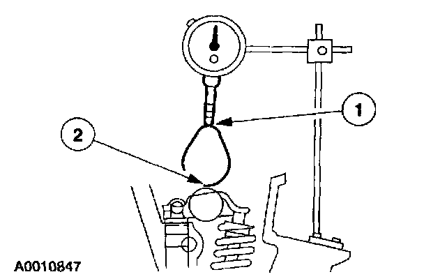 6. Zero the dial indicator. Continue to rotate crankshaft slowly until valve tappet is in fully-raised position (highest indicator reading).