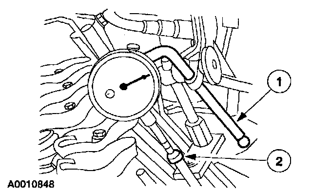 5. Zero the dial indicator. Continue to rotate the crankshaft until the (1) high-lift point of the camshaft lobe is in the fully-raised position (highest indicator reading).