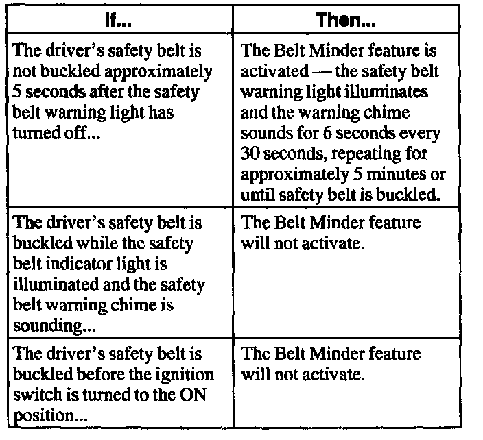 ^ If the driver safety belt is not buckled before the ignition key is turned to the ON position, the safety belt warning light illuminates for one to two minutes and the warning chime sounds for four to eight seconds.