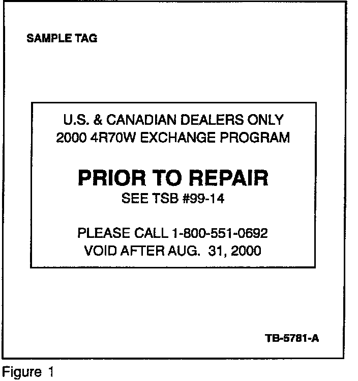 The 4R70W transmission installed in some 2000 model year vehicles will have a green "PRIOR TO REPAIR" tag on the lower pan (Figure 1). The green tag refers to this TSB article and provides a toll-free phone number to be used by all U.S. and Canadian dealers for further service direction (not applicable outside the U.S. or Canada).