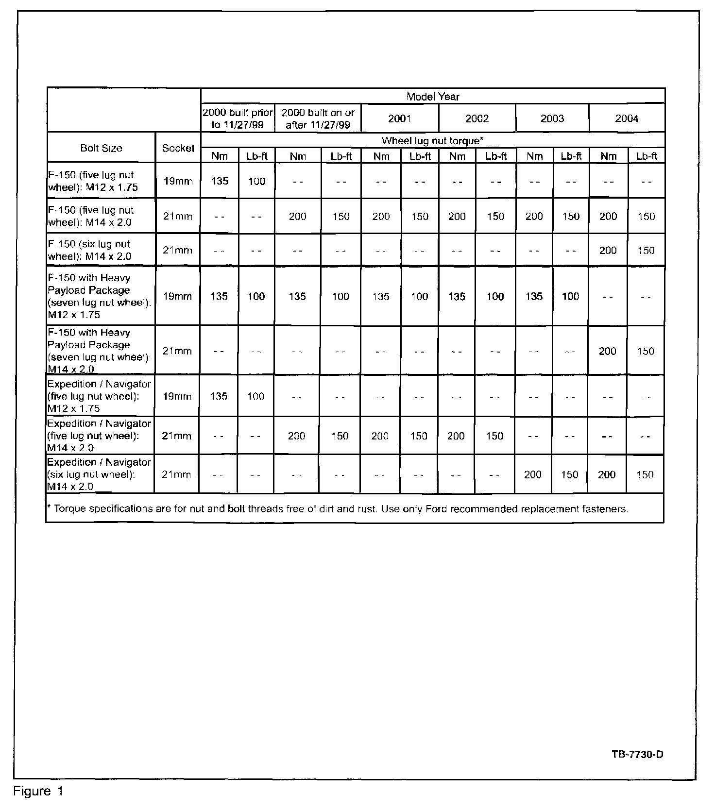 All 2000-2004 F-150 (excluding F-150 equipped with 7-stud wheels and the 7700 payload group) and Expedition/Navigator built on or after November 27, 1999 will have revised wheel stud and wheel nut diameters. The wheel studs/nuts wilt have increased thread diameter from 12 mm to 14 mm. This change will include revised wheels, center wheel ornaments, hubs, brake rotors, wheel nuts, and lug wrench (two piece design and 13 cm (5") longer).