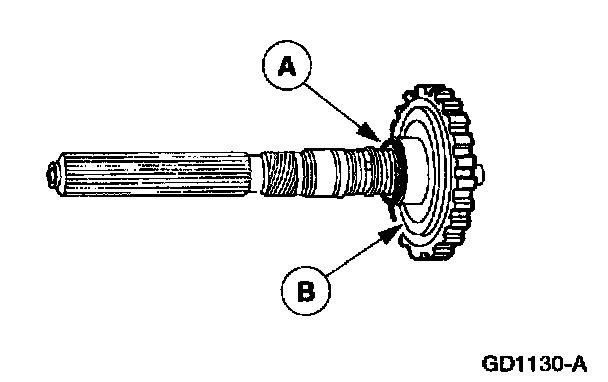 4. Remove the (A) output shaft hub snap ring and the (B) output shaft hub.