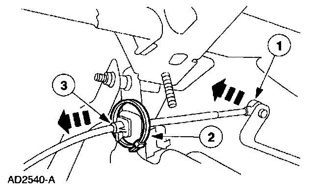 2 Depress the lock tabs to release the transmission shift cable and disconnect the transmission shift cable from the transmission shift cable bracket.