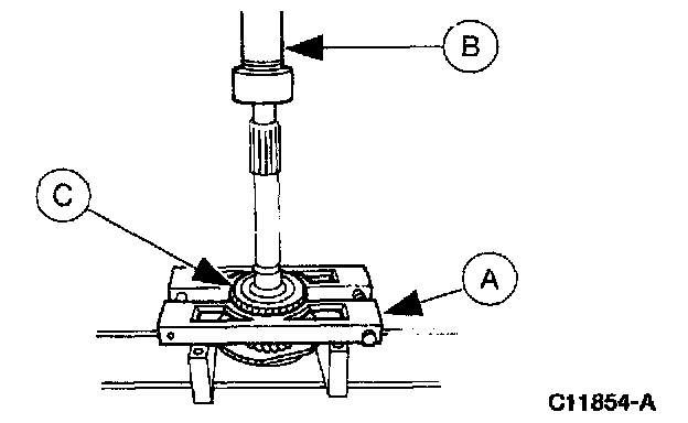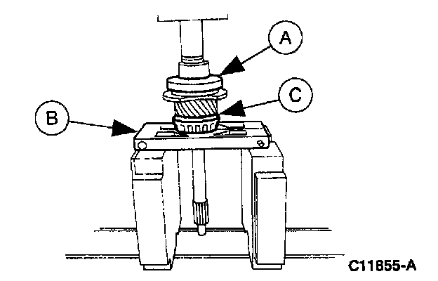 1. Use (A) Bearing Cone Replacer, (B) Pinion Bearing Cone Remover and arbor press to install the (C) bearing.