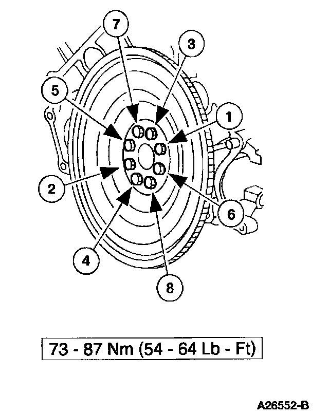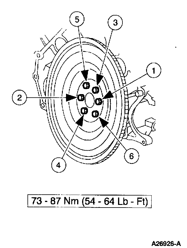 Position the flywheel and install the bolts. Tighten the bolts in two stages: