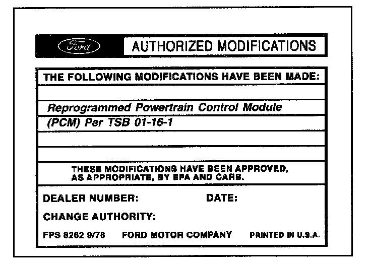 Obtain an Authorized Modifications Decal (FPS 8262 - obtainable through DOES II, 25/pkg) and list the date, dealer number, and summary of modifications performed. Select a prominent place adjacent to the Vehicle Emission Control Information Decal suitable for installing the Authorized Modifications Decal. Clean the area, install the decal, and cover it with a clear plastic decal shield.