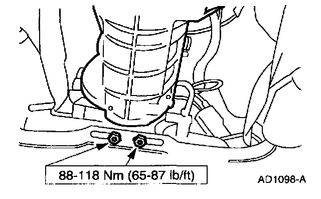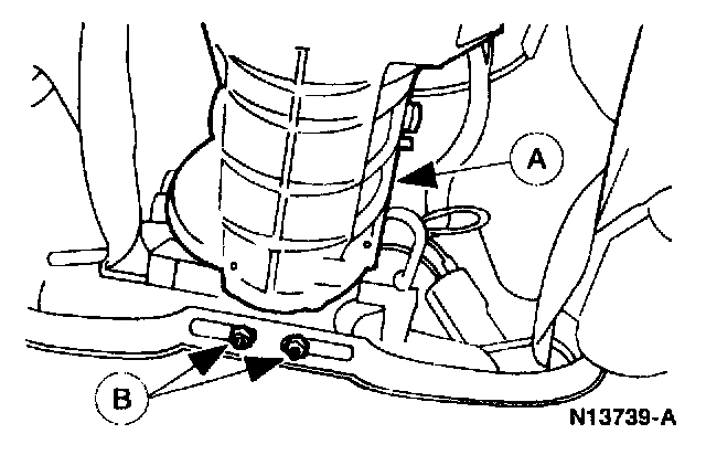 Use the High Lift Transmission Jack to support the (A) transmission. Remove the (B) nuts.