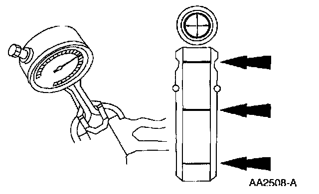 1. Measure the inner diameter of the valve guides in two directions where indicated.