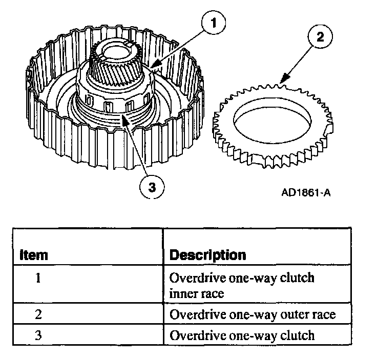 The following information describes the operation of the three 4R100 one-way clutches.One-Way Clutch-Overdrive