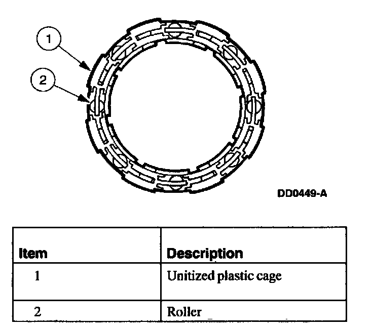 The overdrive one-way clutch, shown in the following illustration, transmits engine torque from the overdrive sun gear to the overdrive ring gear in first, second and third gear range. The overdrive one-way clutch transmits power when the sprays are engaged between the inner and outer races. The inner race is splined to the coast clutch cylinder, which in turn is splined to the overdrive sun gear. The outer race is splined to the overdrive ring gear.