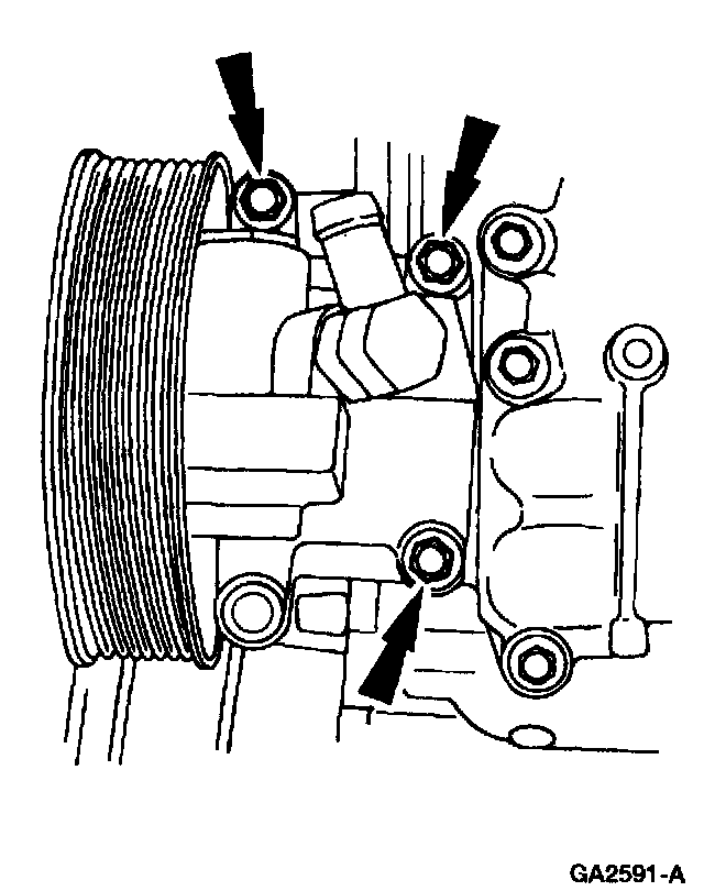 7. Remove the top bolts and the lower bolt and position the power steering pump aside.