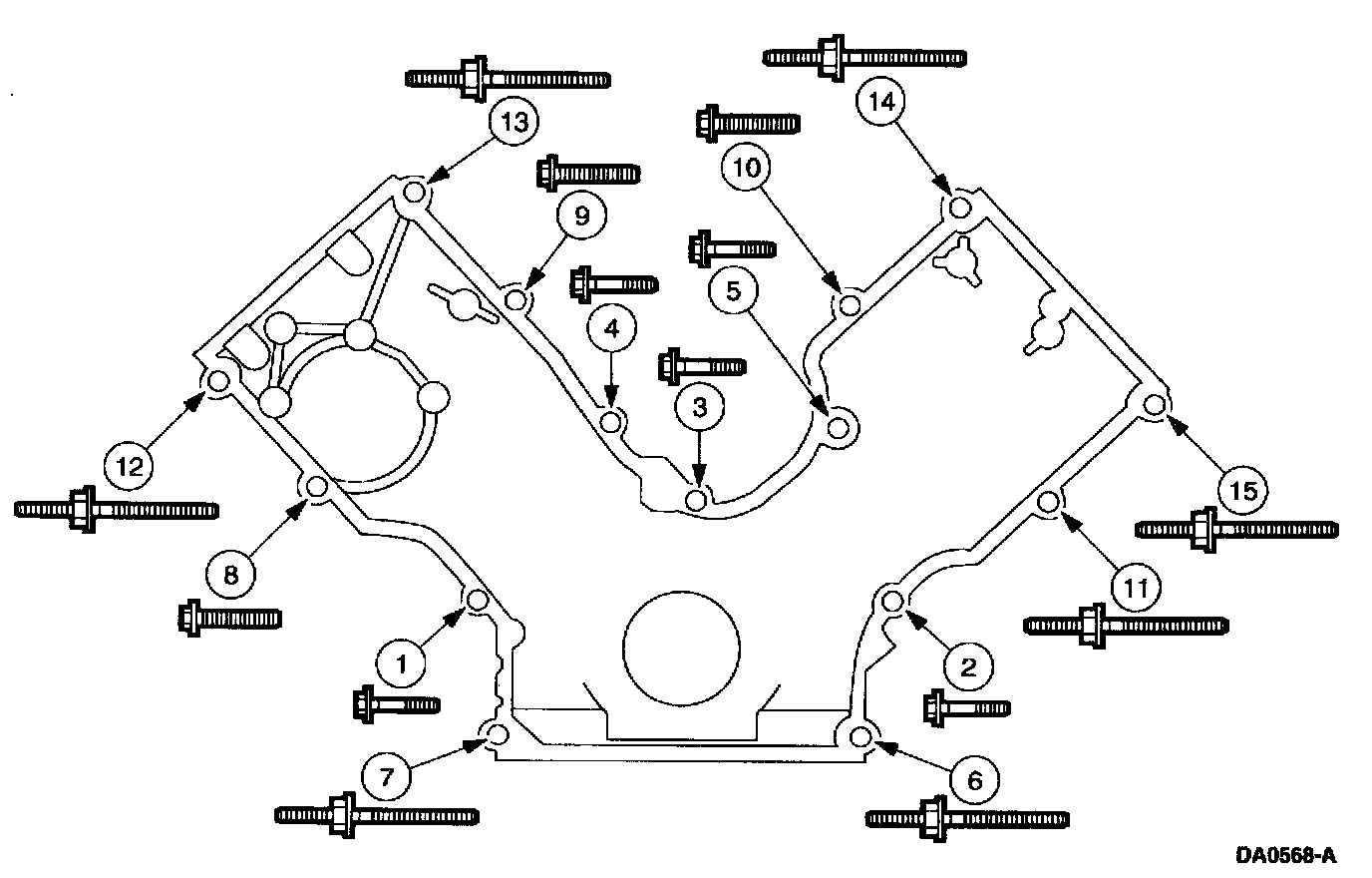 3. Tighten the engine front cover fasteners in sequence in two stages.