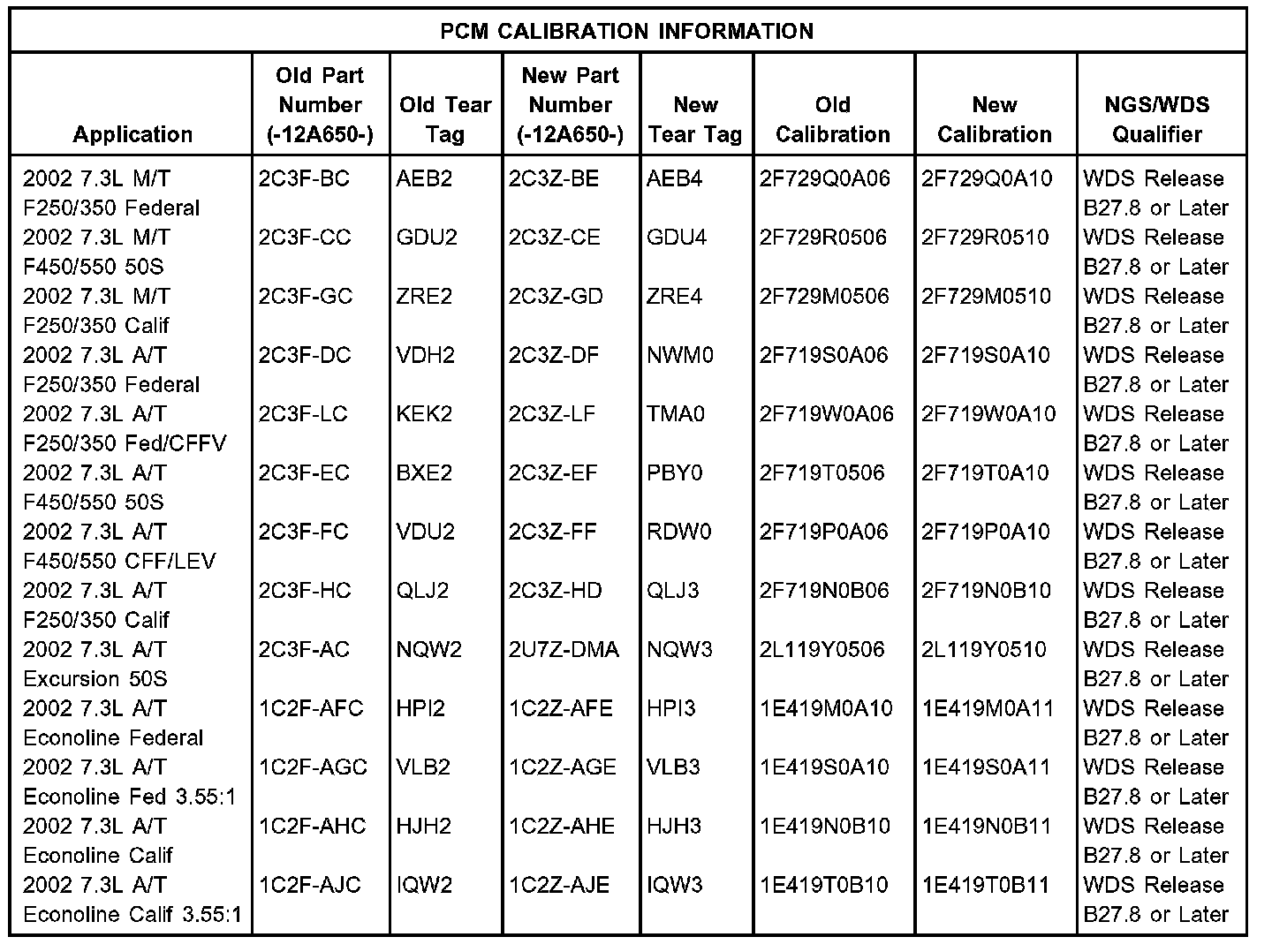 Some 2002 MY 7.3L DIT F-Super Duty, Econoline & Excursions may exhibit the occurrence of P0340 Camshaft Position Sensor false Diagnostic Trouble Code (DTC). F-Super Duty & Excursion may exhibit a late 4R100 3-4 shift (hanging in 3rd gear) at light throttle due to potential lack of converter lock-up occurring after 2-3 shift (most prevalent on 3.73:1 axle ratio vehicles). This may be caused by the Powertrain Control Module (PCM) Calibration.