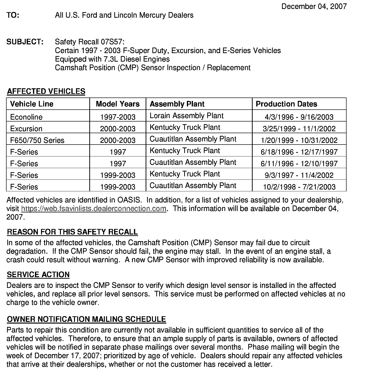 Recall - Camshaft Position Sensor Inspection/Replacement