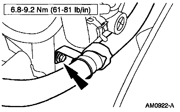 ^ Apply Pipe Sealant With Teflon(R) D8AZ-19554-A or equivalent meeting Ford specifications WSK-M2G350-A2 and ESP-M18P7-A to the threads of the A/C manifold retaining bolt.