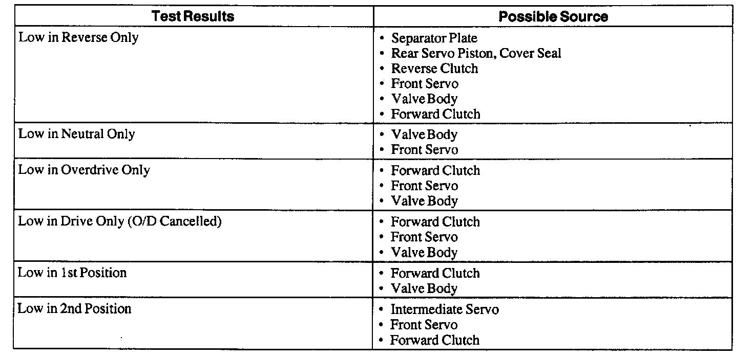 CAUTION: Carry out Line Pressure Test prior to carrying out Stall Speed Test. If line pressure is low at stall, do not carry out Stall Speed Test or further transmission damage will occur. Do not maintain wide open throttle in any gear range for more than five seconds.