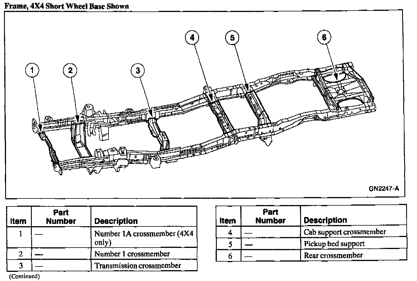 The Number 1A (4X4 only) and the Number 1 crossmembers are welded to the frame side rails. The remaining frame crossmembers are riveted and/or bolted into place.