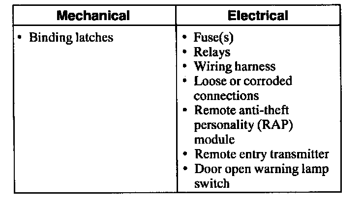 1. Verify the customer concern by operating the electronic door lock control system.2. Visually inspect for obvious signs of mechanical and electrical damage: