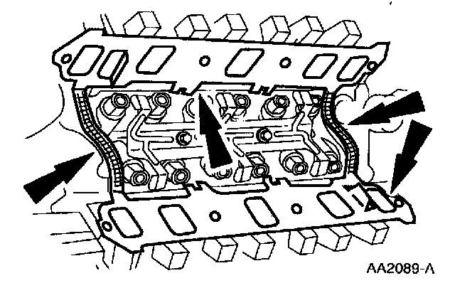 1 Apply a drop of Silicone Gasket and Sealant F7AZ-19554-EA or equivalent meeting Ford specification WSE-M4G323-A4 at the four cylinder block-to-cylinder head seams.