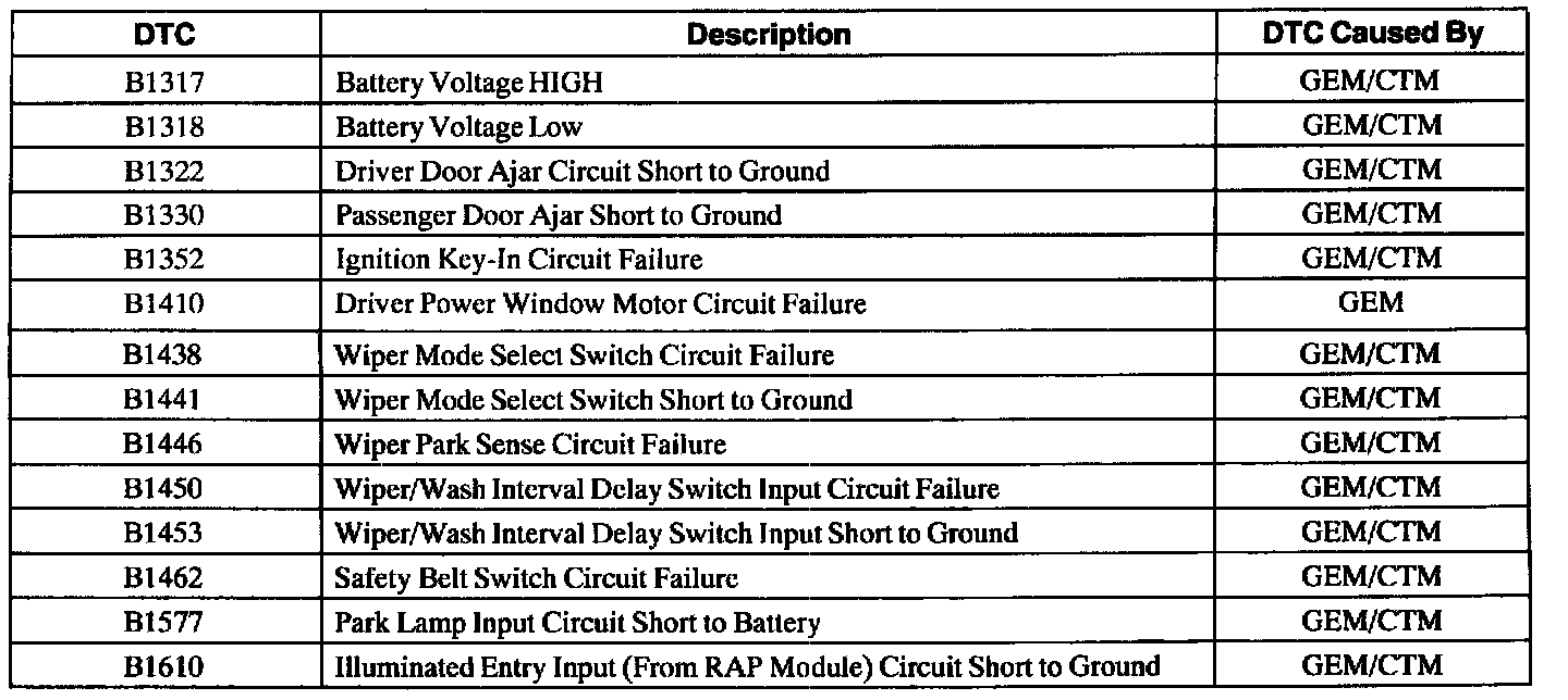 GEM/CTM Wiggle Test Diagnostic Trouble Code (DTC) Index