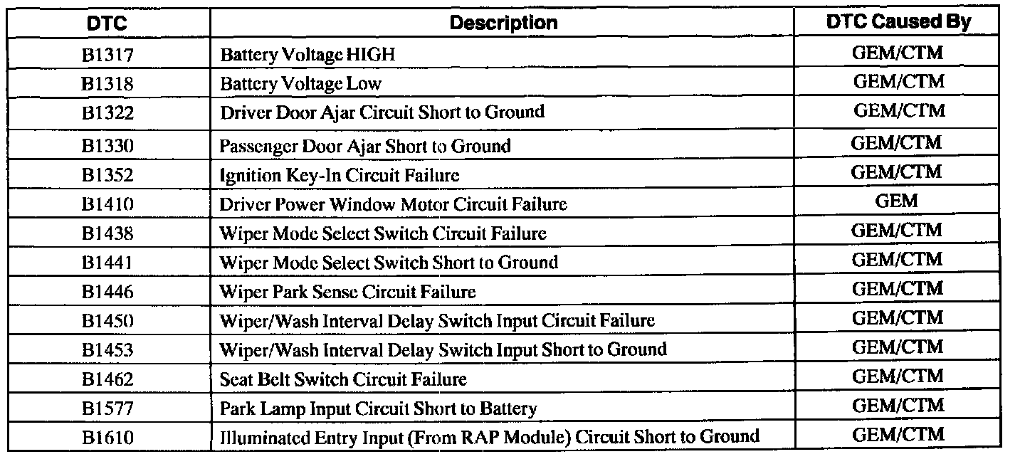 GEM/CTM Wiggle Test Diagnostic Trouble Code (DTC) Index