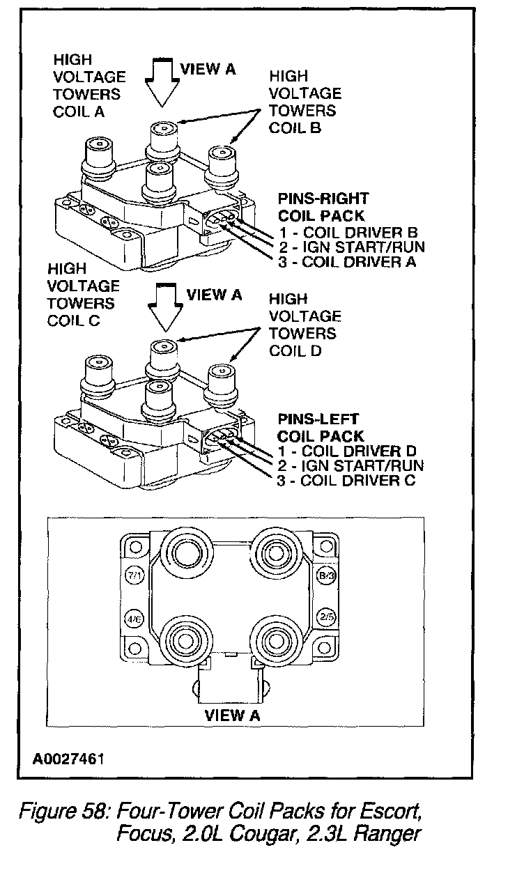 2.5L Contour/Mystique, 2.5L Cougar, 3.0L Taurus/Sable, Windstar, 3.8L, and 3.0L Ranger, 4.2L E/F-Series, 3.8L Mustang, Series (Vertical Connector Six Tower Coil Pack):
