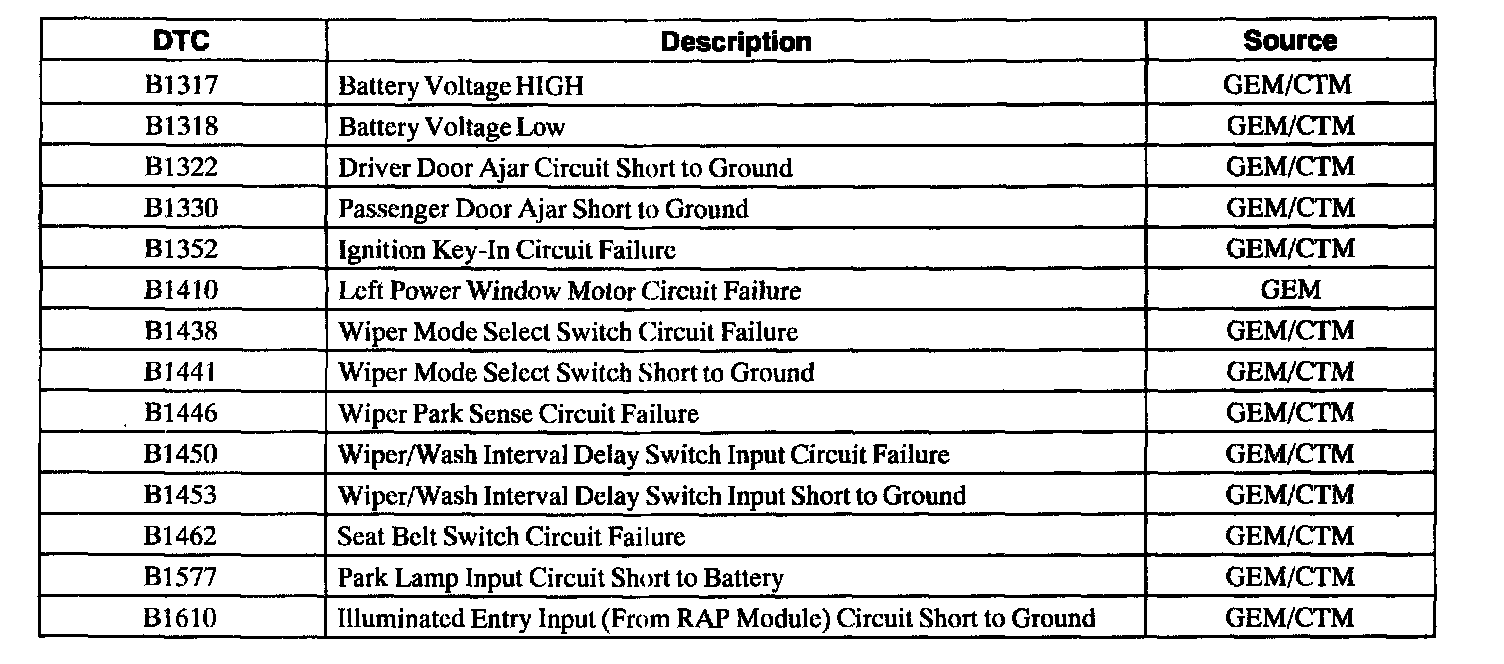 GEM/CTM Wiggle Test Diagnostic Trouble Code (DTC) Index