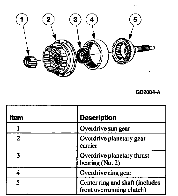 - The front planetary gearset carrier drives the center shaft via the overdrive one-way clutch in 1st, 2nd, and 3rd gears.