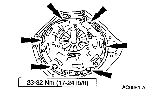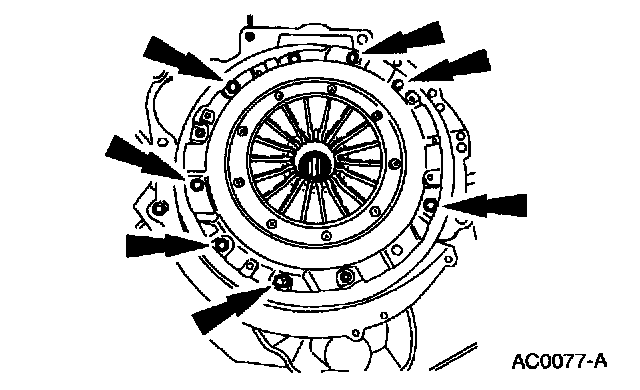 Note: If the parts are to be reused, mark the clutch pressure plate and the flywheel.