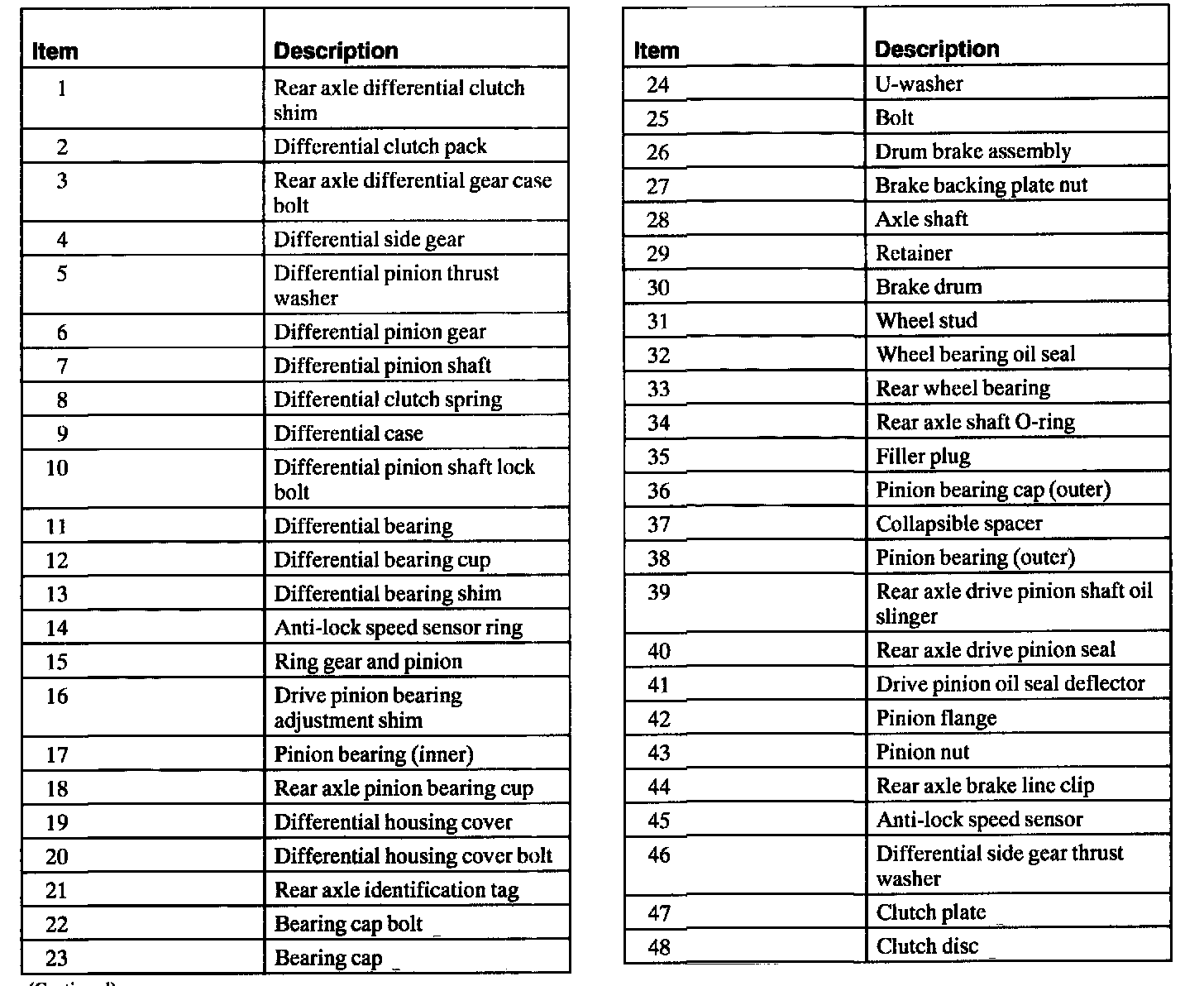 - Differential bearing preload and ring gear backlash are adjusted by differential bearing shims located between the differential bearing cups and the rear axle housing.