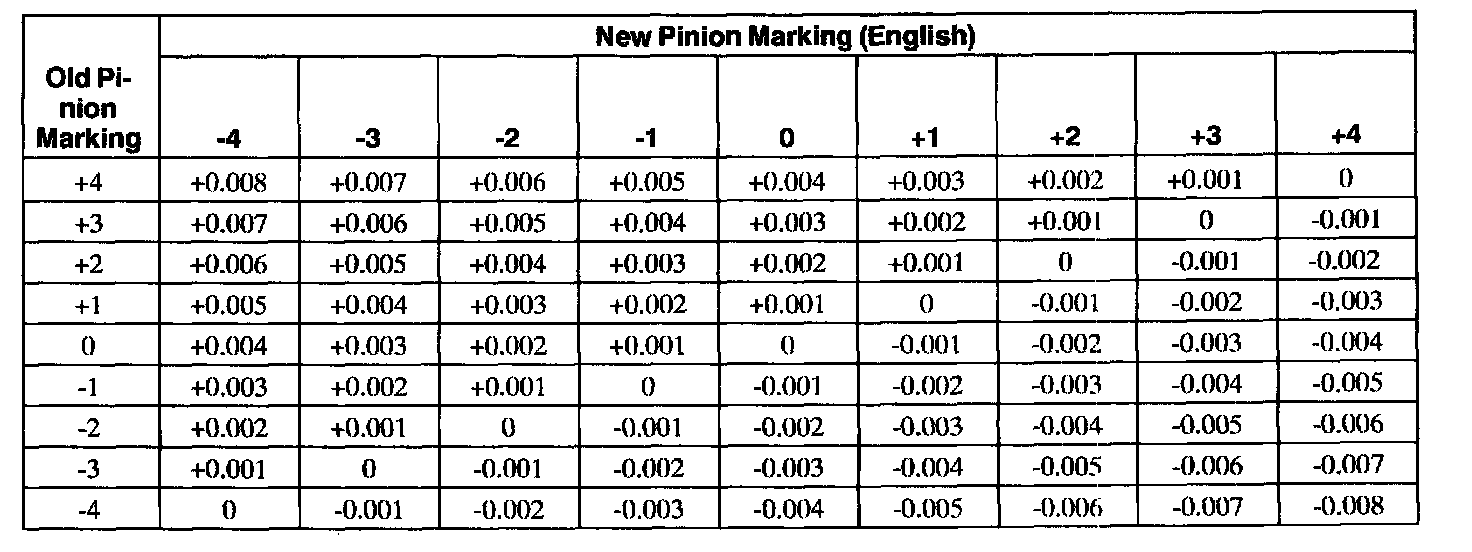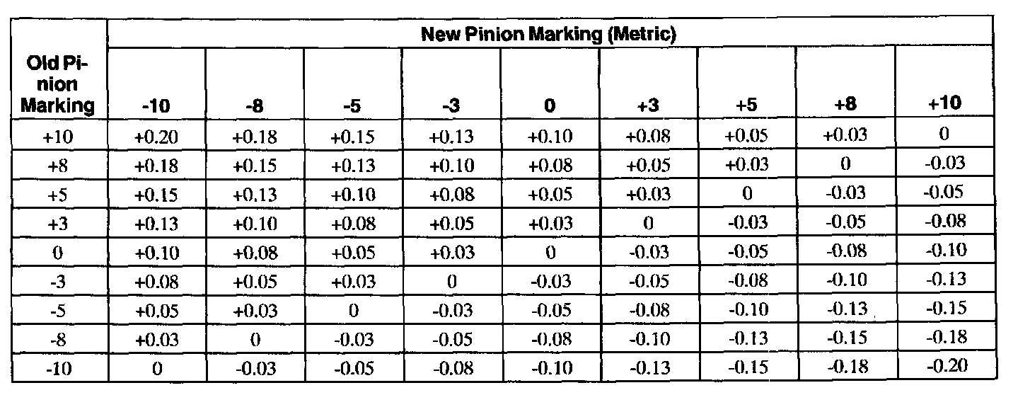 - If installing a new gearset, notice the plus (+), minus (-), or zero (0) etching on both the original and the new drive pinion, and adjust the thickness of the new shim according to the following charts.