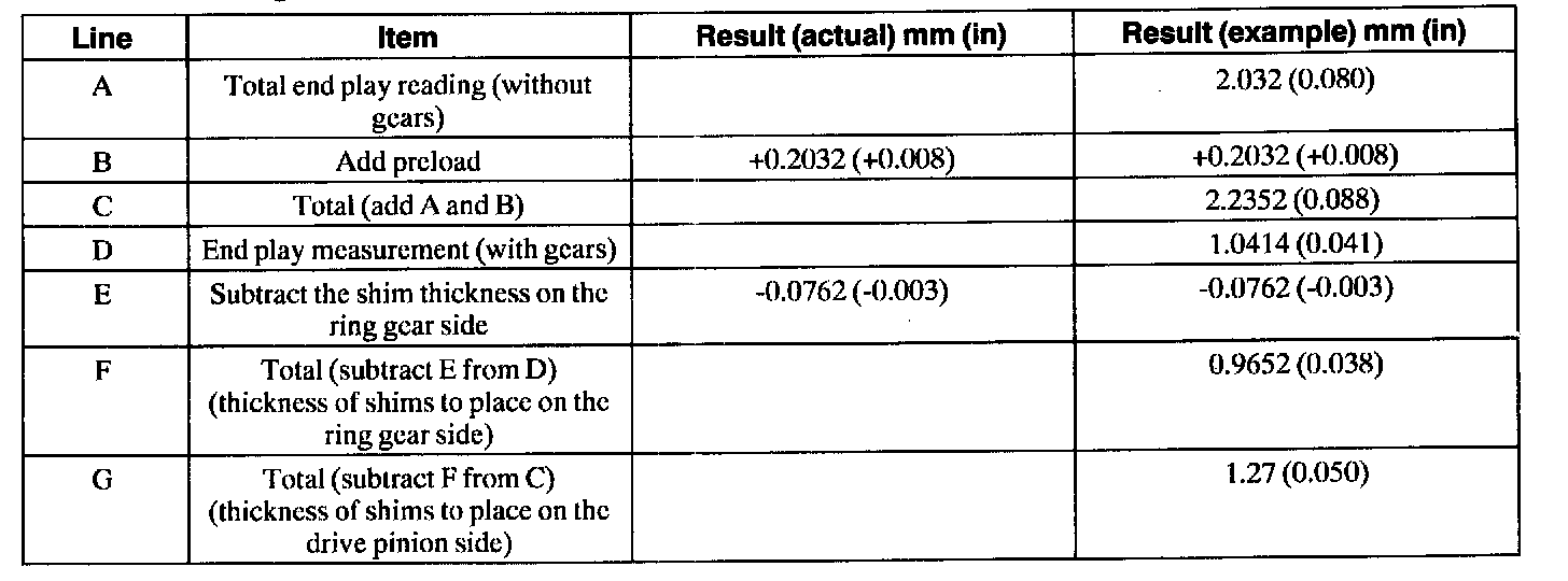 31. Complete the worksheet, and select the appropriate thickness differential shims. New differential shims are available in 0.0762 mm (0.003 inch), 0.127 mm (0.005 inch), 0.254 mm (0.010 inch), and 0.762 mm (0.030 inch) thickness.