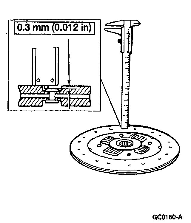 2. Check for a worn clutch disc lining. Measure the minimum allowable depth to the rivet heads with a slide caliper.