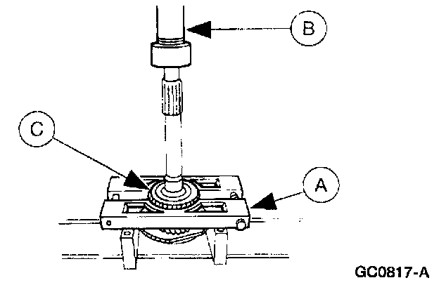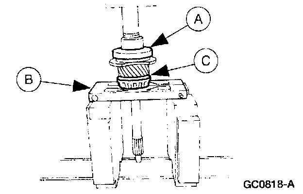 1. Use (A) Bearing Cone Replacer, (B) Bearing Cone Remover, and an arbor press to install the (C) bearing.