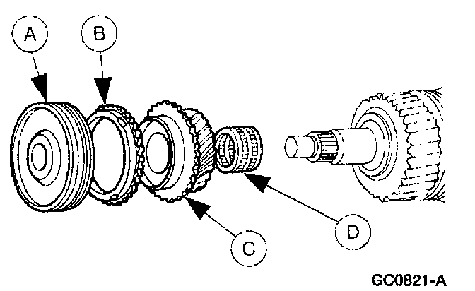 1. Remove the (A) transmission input shaft pilot bearing, the (B) bearing outer snap ring, the (C) third and fourth synchronizer spacer and the (D) thrust bearing.