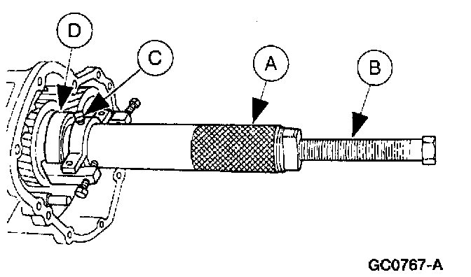 11. Use (A) Remover/Replacer Tube, (B) TOD Forcing Screw and (C) Bearing Puller to remove the (D) output shaft rear bearing.