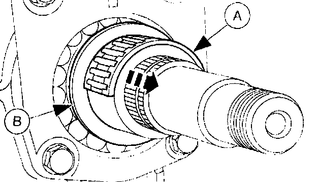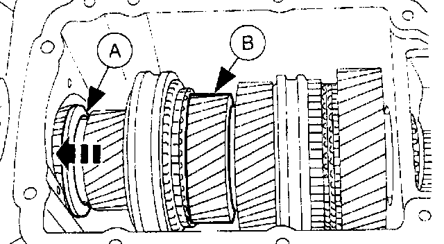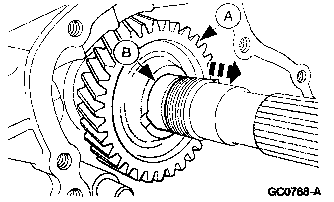 12. Remove the output shaft (A) reverse gear and (B) bushing.