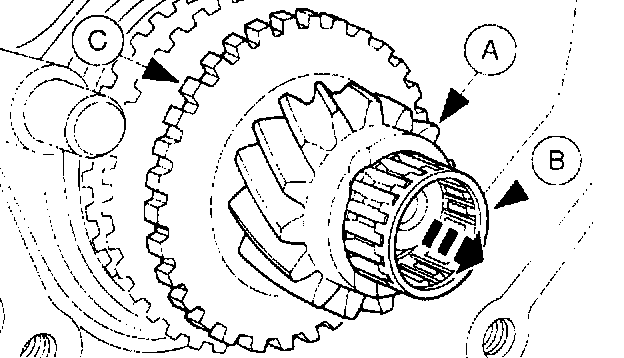 14. Remove the (A) countershaft reverse gear, the (B) two countershaft reverse gear bearings, and the (C) reverse synchronizer blocking ring.