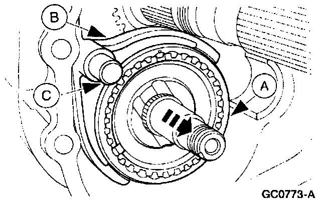 17. Remove the fifth/reverse (A) synchronizer, (B) gear shifter fork, and (C) reverse gear shift rail as an assembly.