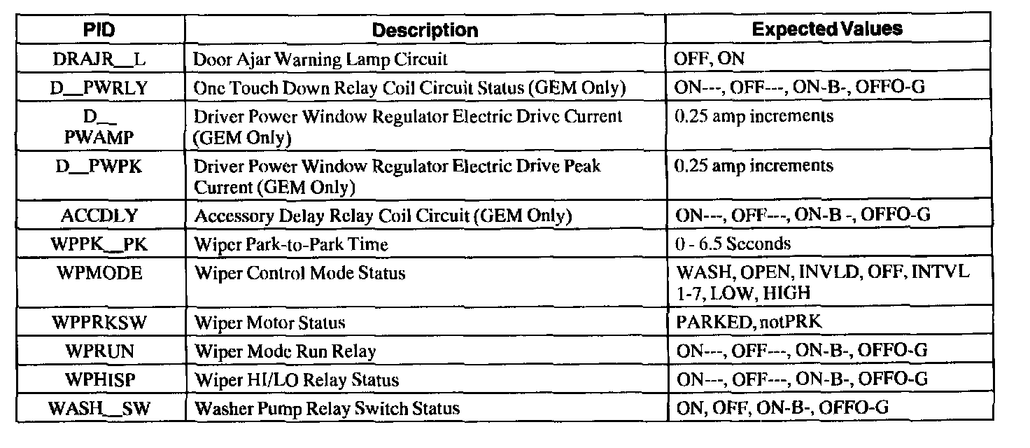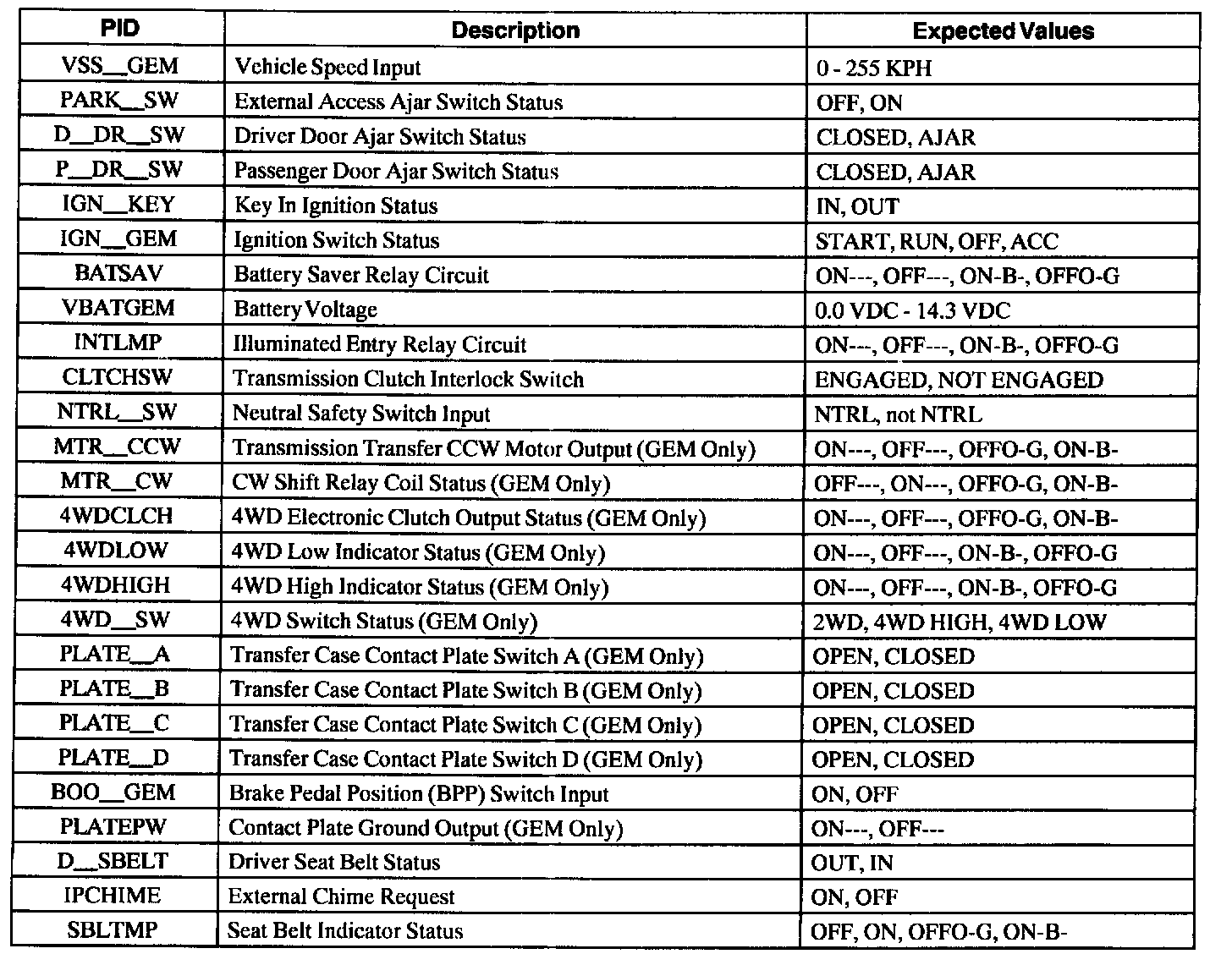 Pinout Values and Diagnostic Parameters