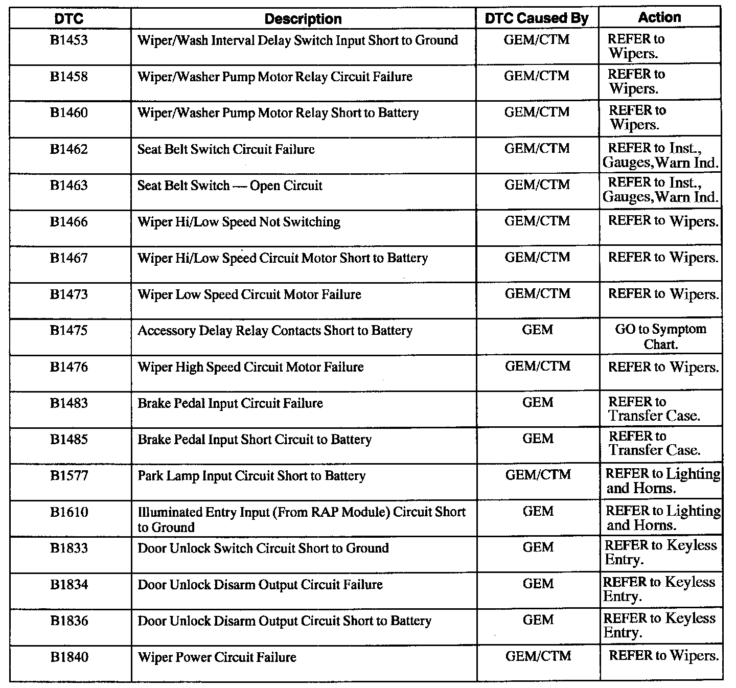 GEM/CTM Diagnostic Trouble Code (DTC) Index