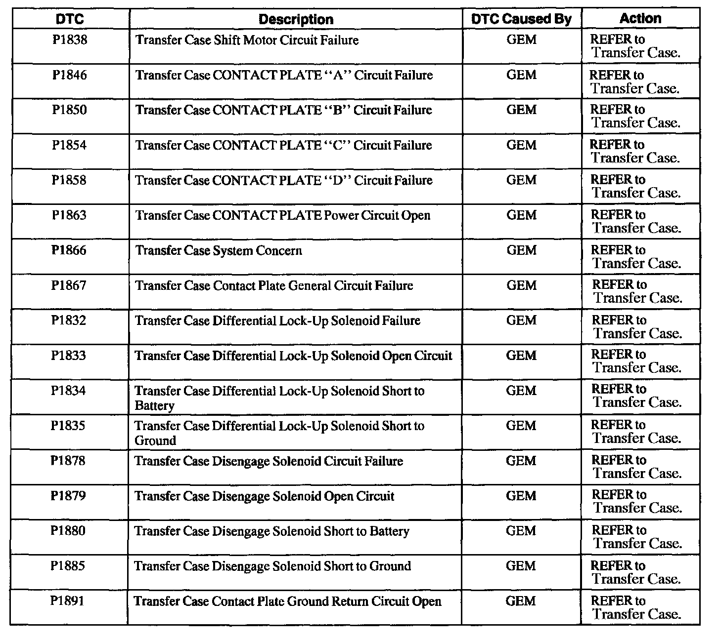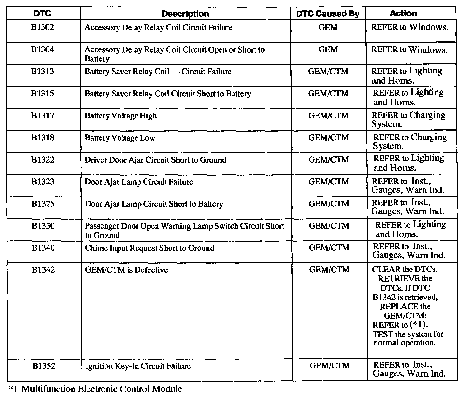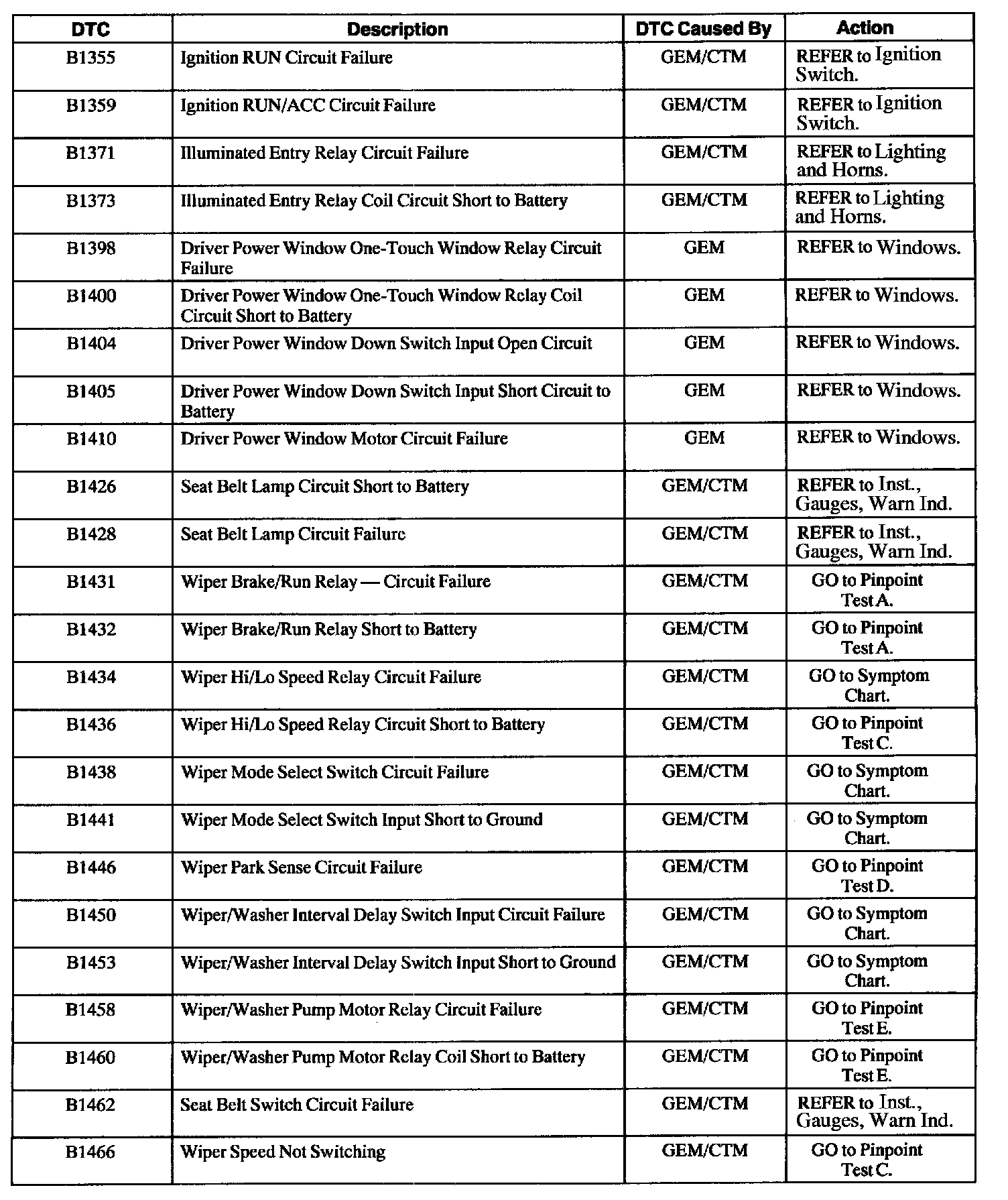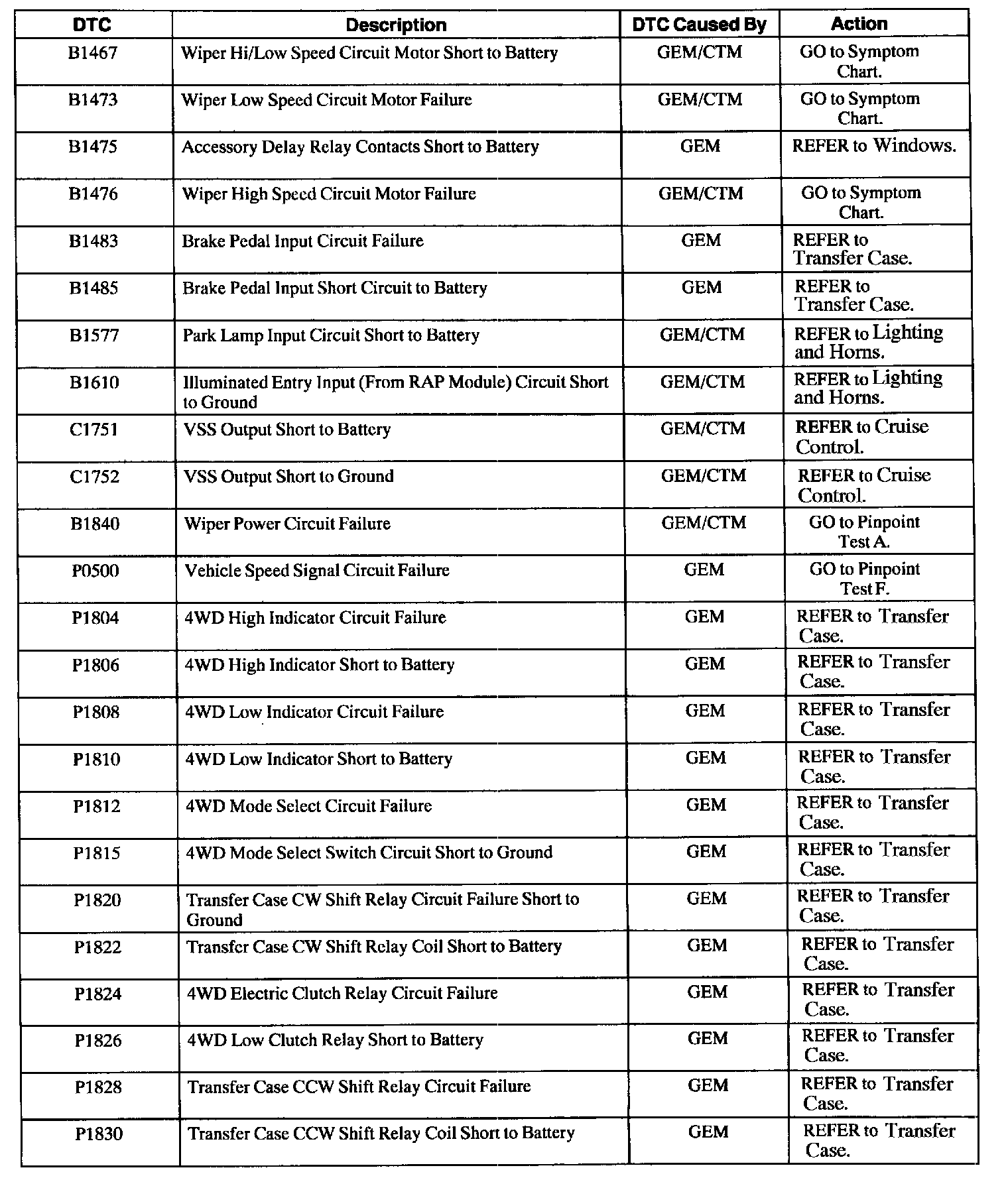 GEM/CTM Diagnostic Trouble Code (DTC) Index
