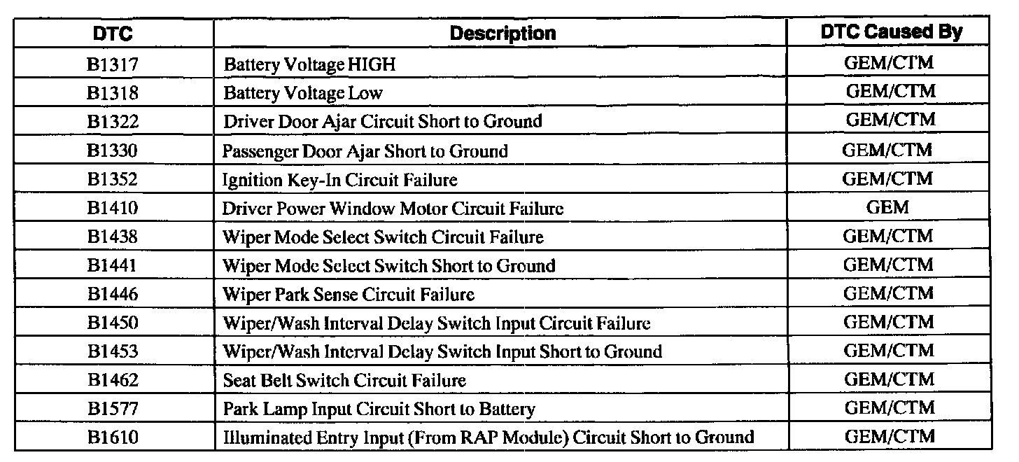 GEM/CTM Wiggle Test Diagnostic Trouble Code (DTC) Index