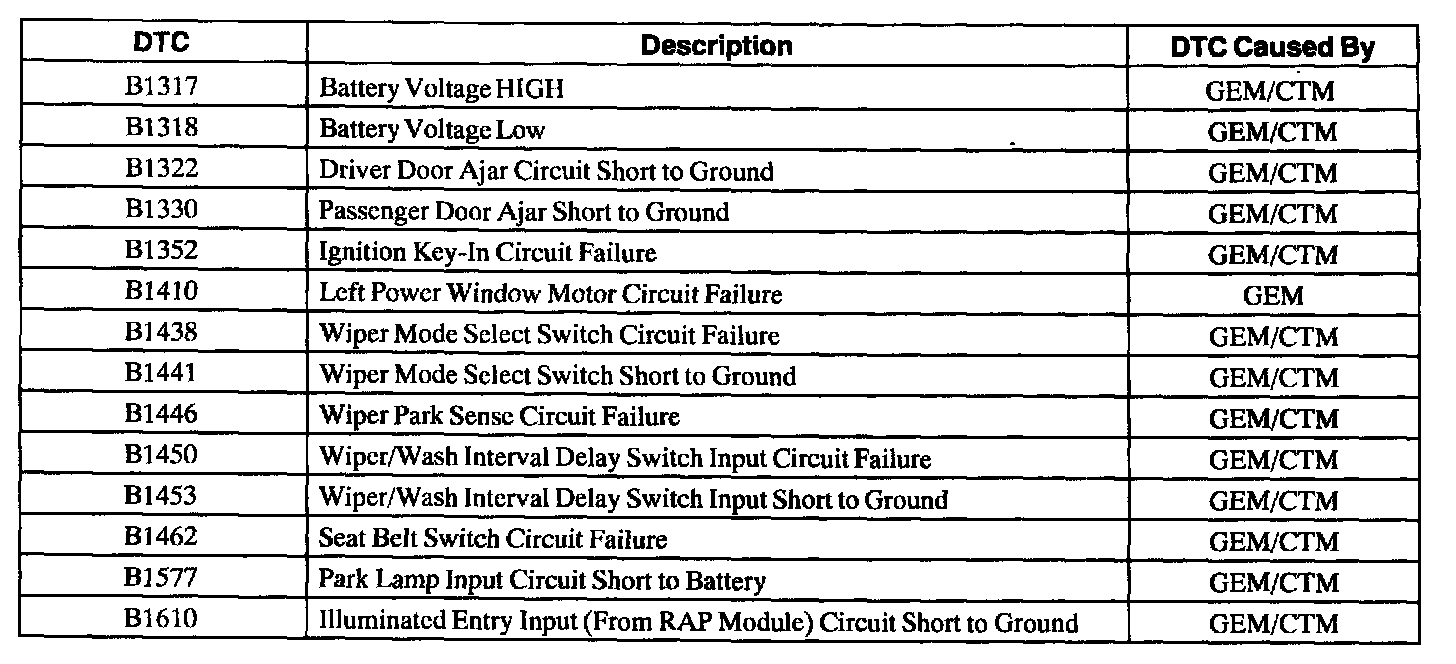 GEM/CTM Wiggle Test Diagnostic Trouble Code (DTC) Index