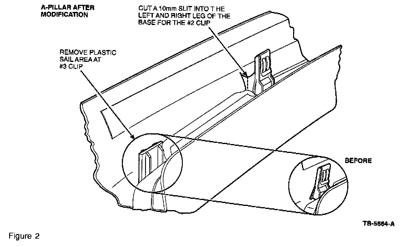 4. Cut two slits approximately 10 mm long into the plastic base of # 2 clip (# 2 clip is located middle of trim piece) at the two areas indicated (Figure 2).