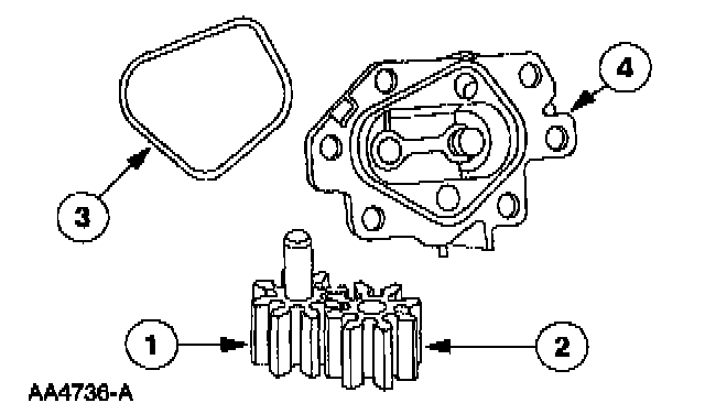 5. Remove the (1) oil pump drive gear, the (2) oil pump driven gear, the (3) oil pump O-ring seat and the (4) oil pump cover. Discard the (3) oil pump O-ring seal.