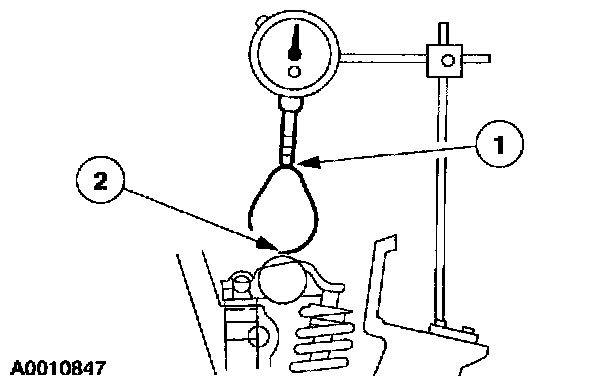 6. Zero the dial indicator. Continue to rotate crankshaft slowly until valve tappet is in fully-raised position (highest indicator reading).